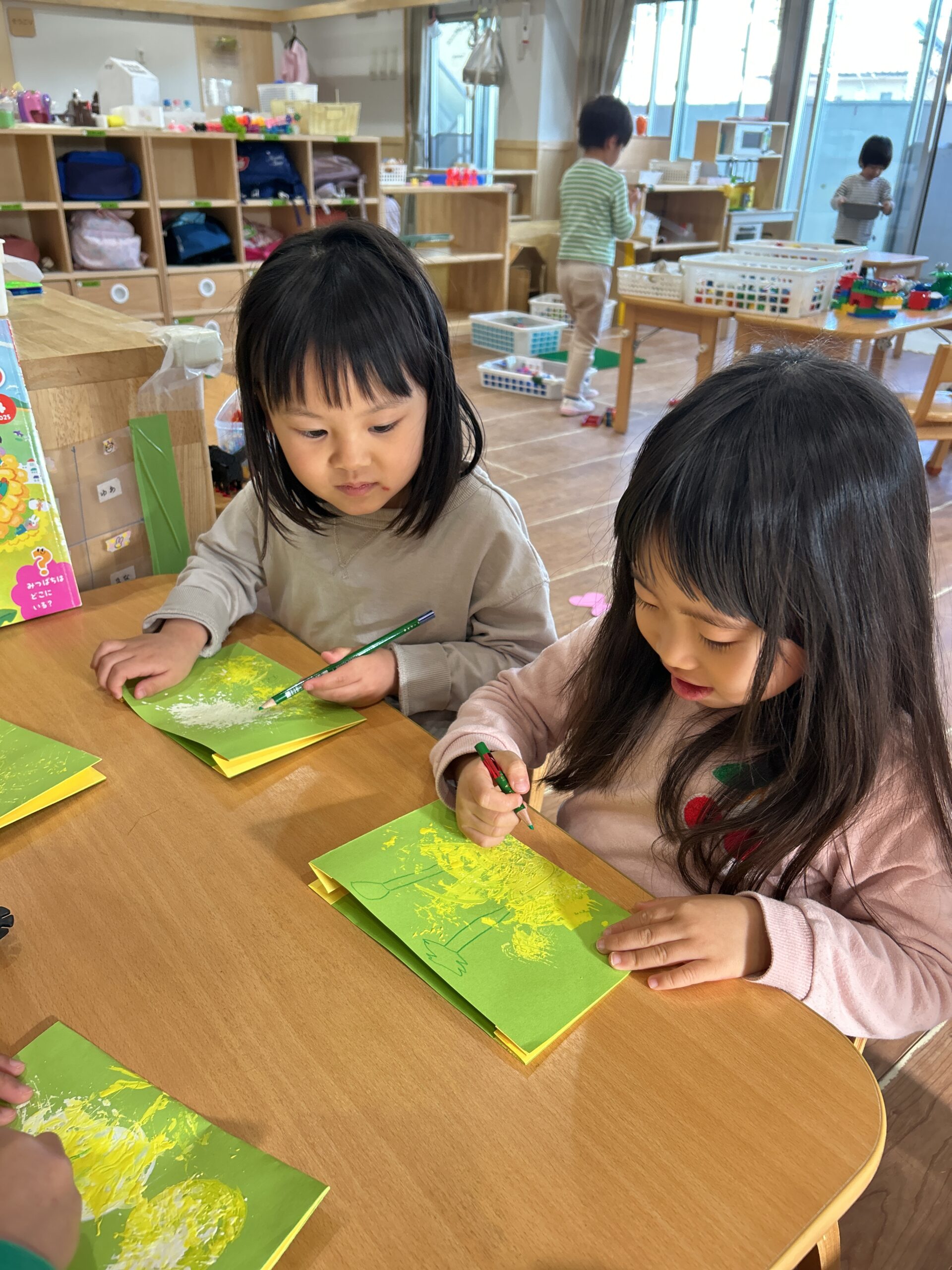 葉っぱや茎を丁寧に描き込み、自分だけの「花摘みカバン」がどんどん出来上がっていきます。完成が近づにくにつれて子どもたちの顔にはキラキラした笑顔が自然とこぼれてきました。