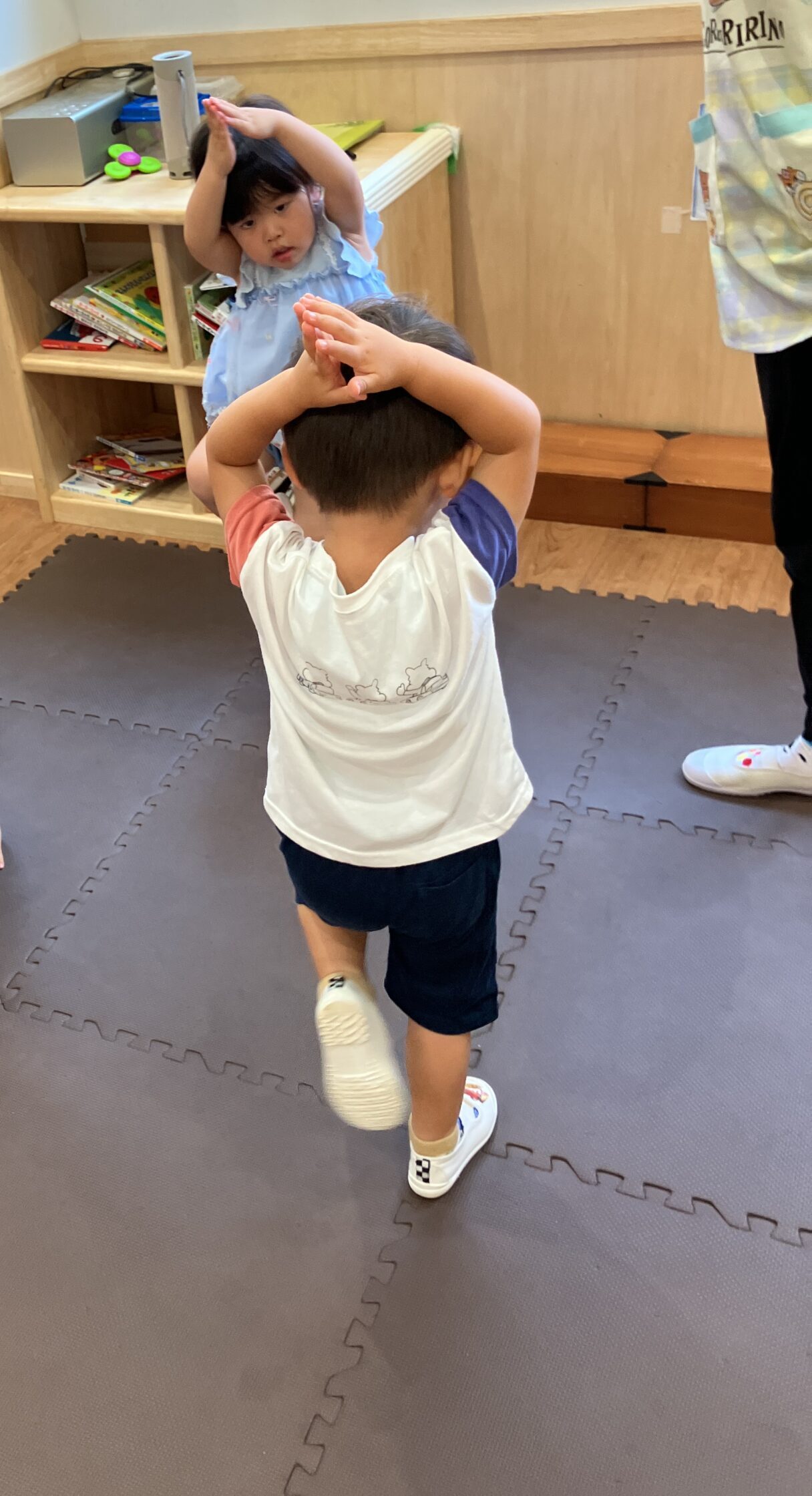 お友達と近くで遊ぶことが増えて真似っこする姿も見られます!同じことをやってみると嬉しい気持ちも芽生え、ニコニコが溢れています♪そこから学びに繋がり挑戦してみたり、できる事が増えていくのですね! 一緒に遊ぶの楽しいね♡ &