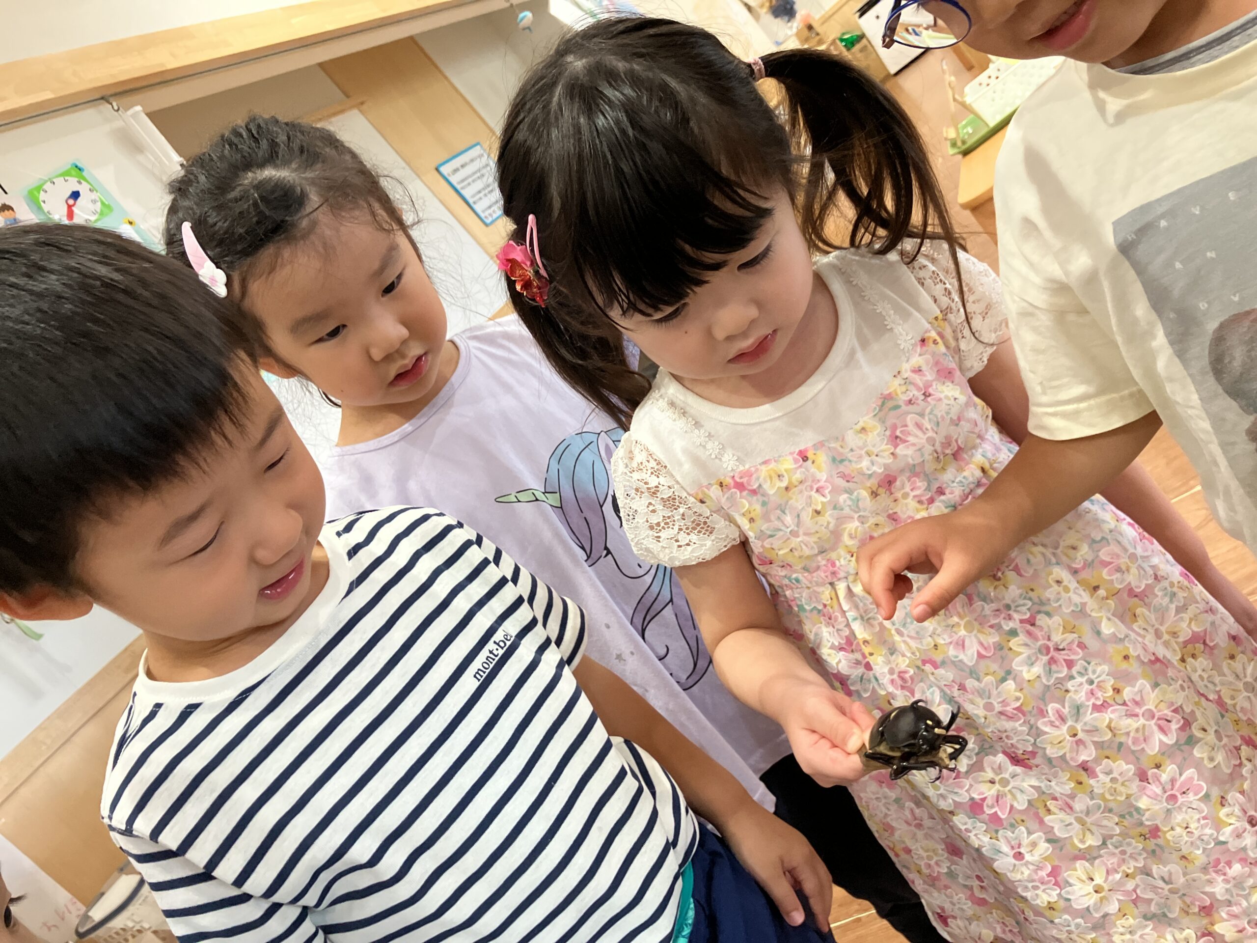 4歳児クラスではカブトムシを飼育しております。子ども達からの「飼ってみたい」という声を拾い、飼育することになりました。日々お世話をする中で子どもなりに様々なことに気が付き、友達と気付いたことを共有する姿が見られています。また、愛着を持ち親しむ中で生命の尊さや不思議さを感じることが出来ている子ども達です。