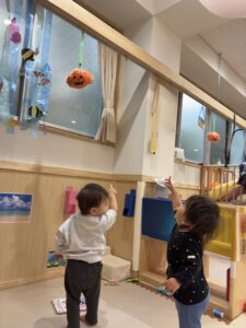 子どもたちが破いた花紙はハロウィンのカボチャになって、お部屋に飾っています♪