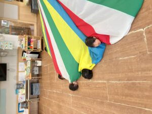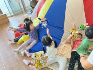 4・5歳児クラス一緒にプレイバルーン遊びをしました。暑い日が続きますが、バルーンを動かすと出てくる風に子どもたちは「気持ちいい~!」と大興奮です。キラキラの手具を使った時は踊りも取り入れてみるなどしましたよ。