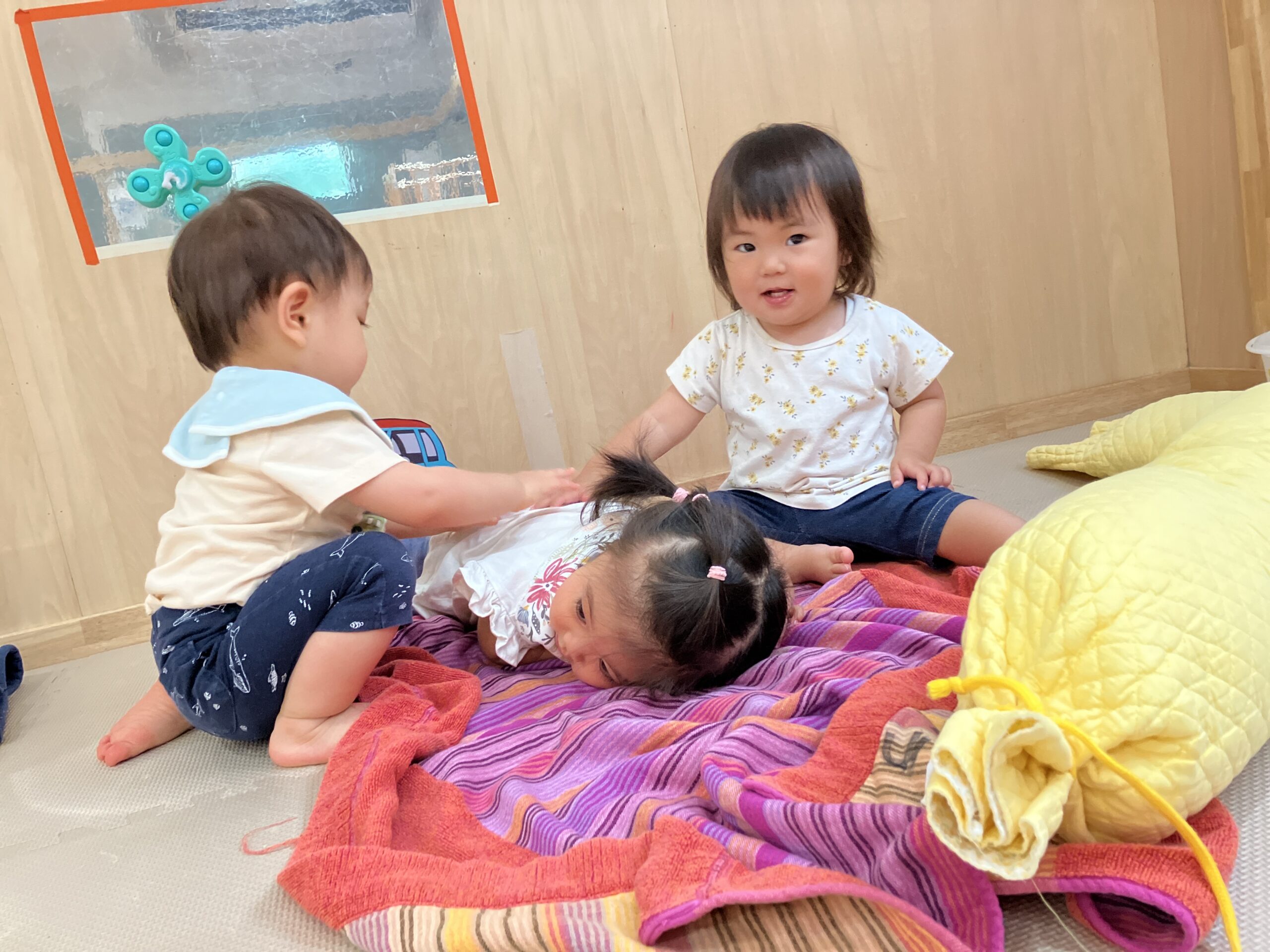 最近はお友達との関わりも増えてきたステラ組の子どもたち。 お友達と顔を見合わせて笑い合ったり、ハイタッチをしたり、ハグをしたりして仲良く過ごしています! また保育者の真似をして、寝転がっているお友達にトントンと寝かしつけ